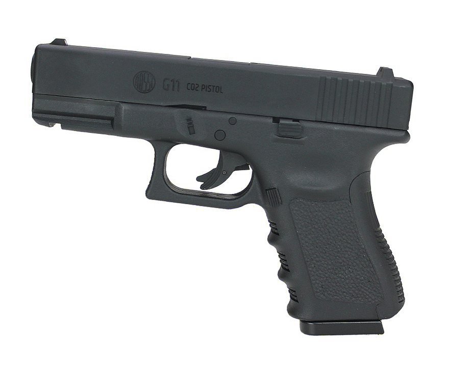 A Pistola de Pressão Co2 Rossi G11 plataforma Glock G19 cal 4.5mm de esfera de aço, tem escada de 1:1, frente a pistola real. Possui corpo em polímero na cor preta e com partes em metal. Conta slide fixo, trilho inferior de 20 mm (picatinny), empunhadura ergonômica, apoio de polegar e conjunto de mira aberta instalado. Semi automática, utiliza como munição esfera de aço 4.5mm e disparos com velocidade superiores a 130 m/s.