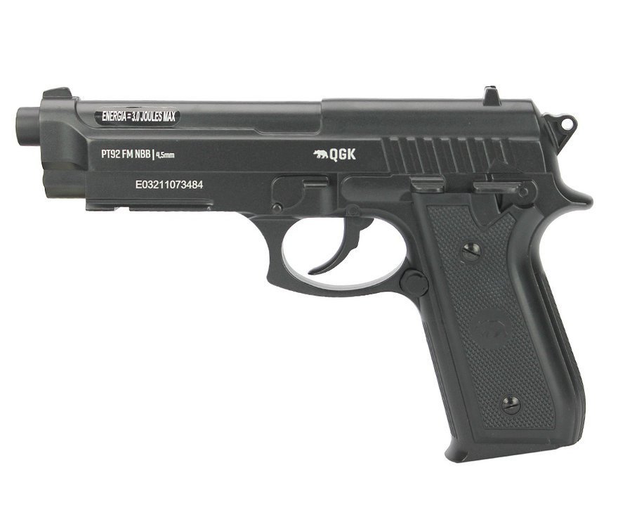 Esta pistola de pressão de ação por Gás CO2 PT 92 NBB esferas de aço calibre 4,5mm da QGK é baseada no modelo Taurus PT92. Esse modelo possui o corpo inteiramente confeccionado em metal. Seu Slide fixo, trava de segurança manual, miras fixas, velocidade média de 130 m/s atingindo 3 joules de potência e magazine para até 19 esferas de metal, além de trilho inferior de 22mm.
