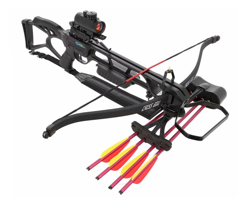 - Material: Alumínio (corpo), polímero de alta densidade (coronha/empunhadura), fibra de vidro (arco recurvo)