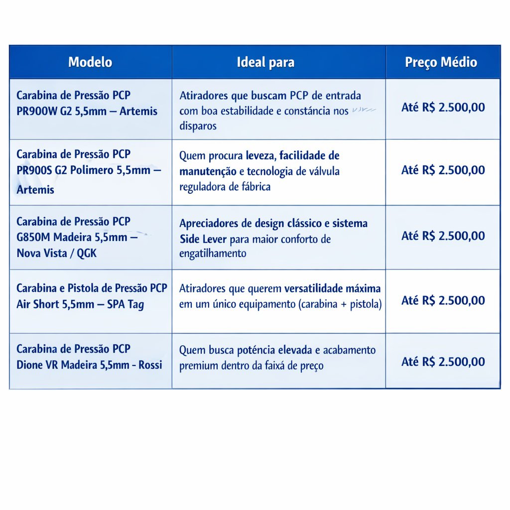 Comprar uma carabina PCP de qualidade não precisa, necessariamente, significar um investimento alto. Hoje, já é possível encontrar excelentes modelos de entrada por valores acessíveis, capazes de entregar boa precisão, potência equilibrada e uma experiência muito satisfatória para quem está começando ou para o atirador que busca custo-benefício.